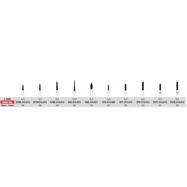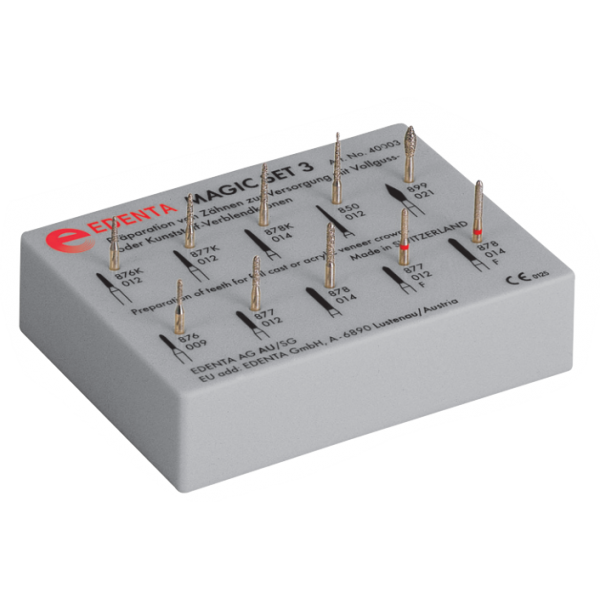Kit preparação de dentes para a reabilitação com coroas metálicas maciças ou com coroas revestidas com acrílico.