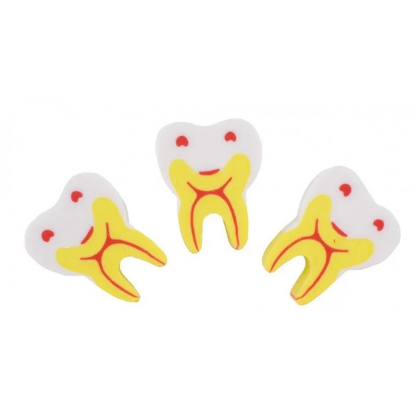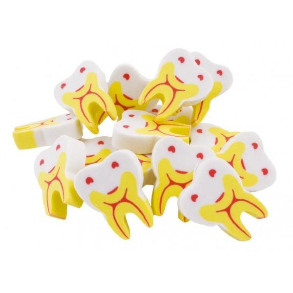 Borrachas engraçadas com a forma de um dente sorridente em ambos os lados.