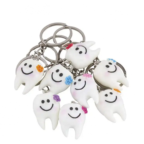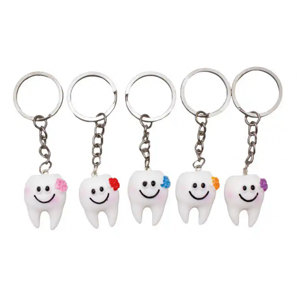 Porta-chaves em forma de molar, com sorriso e flor colorida.
