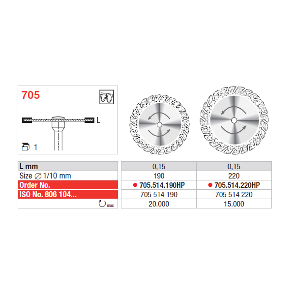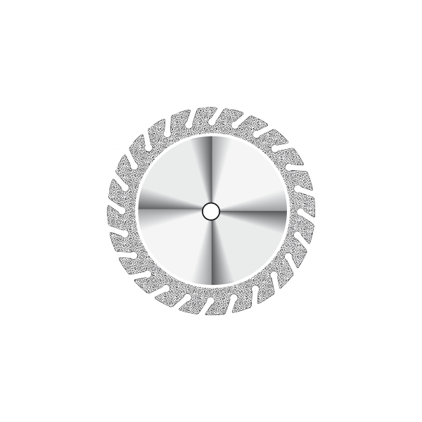 Disco diamantado em granulação fina, serrilhado, para separar cerâmica, gesso, acrílico e facetas acrílicas.